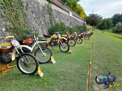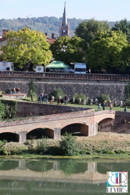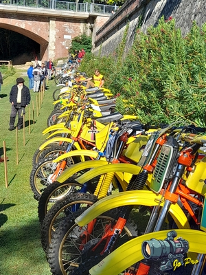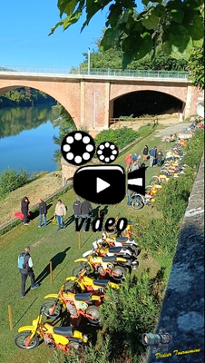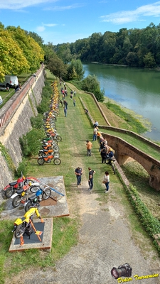 Dans un écrin de verdure à côté du pont qui enjambe le Tarn et au pied du mur de l'esplanade Jean Moulin, les 64 motos ont été ligné dans l'ordre chronologique de fabrication.