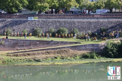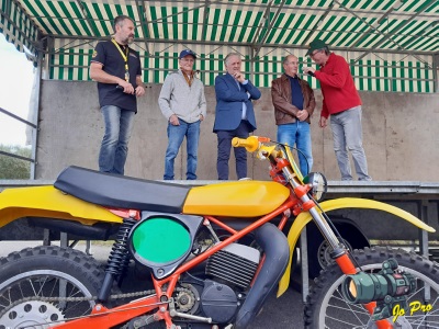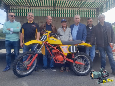 Photo de "famille" derrière la réplique de la 125 Portal Mugen